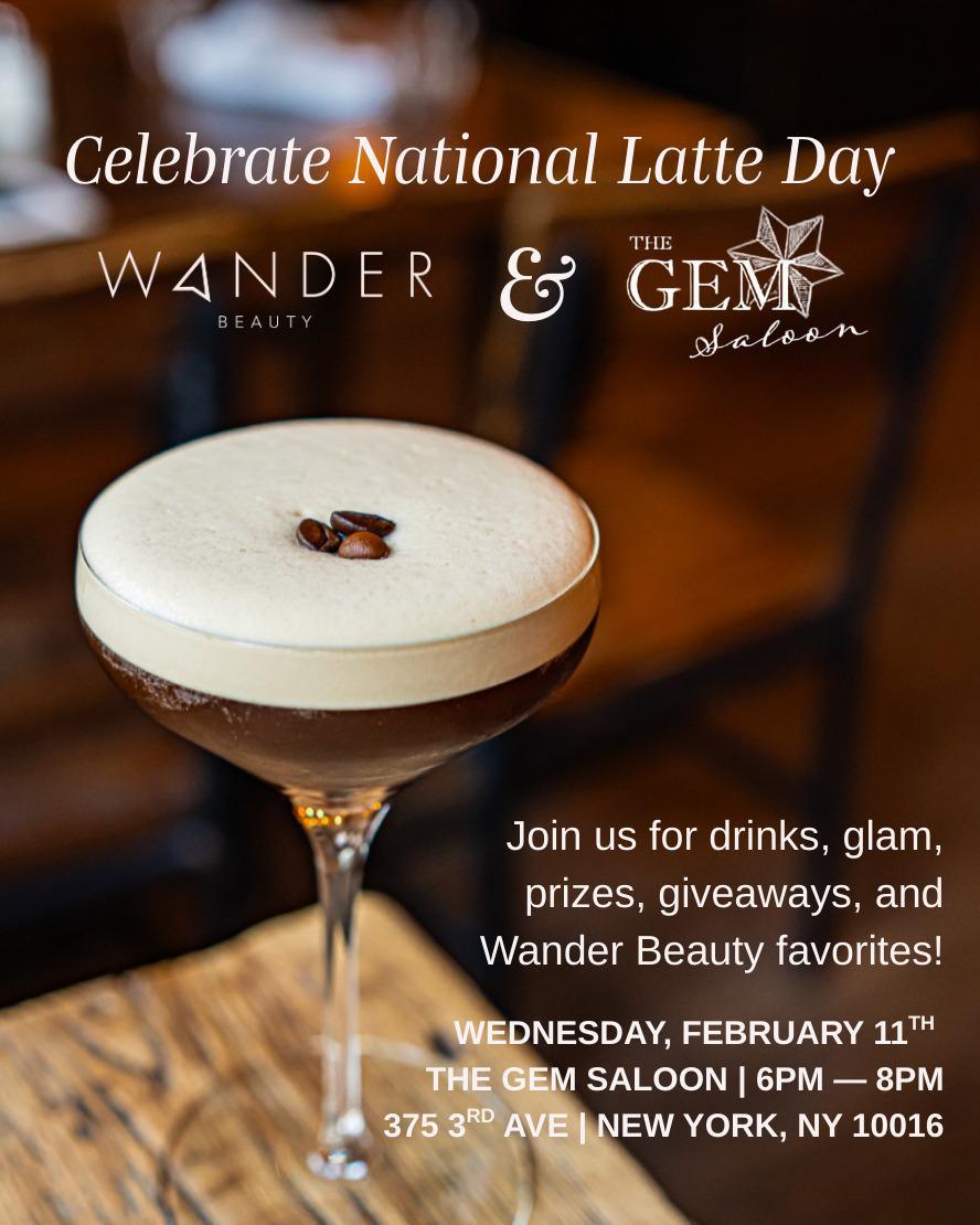 Wander Beauty celebrating National Latte Day with ther friends at The Gem Saloon! Think espresso martinis, Wander Beauty favorites, exclusive giveaways, and a little midweek magic.